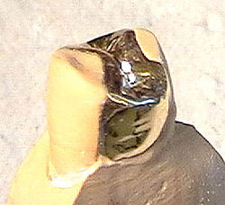 [[Datei:Inlay2.jpg|mini|Inlay auf einem [[Prämolar]]en (Sägemodell), inkagoldgelbe Goldlegierung]] |