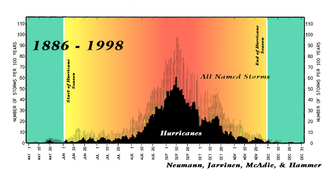 Nur im Atlantik dauert die offizielle Saison vom 1. Juni bis zum 30. November. Im Nordostpazifik beginnt sie am 15. Mai und im Nordwestpazifik dauert sie ganzjährig.