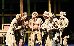 [edit]The mechanicals, Peter Quince and fellow players Nick Bottom, Francis Flute, Robin Starveling, Tom Snout and Snug plan to put on a play for the wedding of the Duke and the Queen, "the most lamentable comedy and most cruel death of Pyramus and Thisbe". Quince reads the names of characters and bestows them on the players. Nick Bottom, who is playing the main role of Pyramus, is over-enthusiastic and wants to dominate others by suggesting himself for the characters of Thisbe, the Lion, and Pyramus at the same time. Quince insists that Bottom can only play the role of Pyramus. Bottom would also rather play a tyrant and recites some lines of Ercles. Bottom is told by Quince that he would play the Lion so terribly as to frighten the duchess and other ladies so much that the Duke and Lords would have the players hanged. Snug remarks that he needs Lion's part because he is "slow of study". Quince assures Snug that the role of the lion is "nothing but roaring." Quince then ends the meeting by telling his actors "At the Duke's oak we meet".