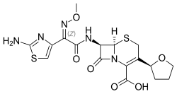 [edit]Cefovecin is a broad-spectrum, third-generation cephalosporin antibiotic administered by subcutaneous injection.[4] It is used to treat skin and soft tissue infections in dogs and cats.[4] The antimicrobial effects last for 14 days following administration.[5]
