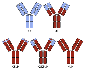 Many chimeric protein drugs are monoclonal antibodies whose specificity for a target molecule was developed using mice and hence were initially "mouse" antibodies. As non-human proteins, mouse antibodies tend to evoke an immune reaction if administered to humans. The chimerization process involves engineering the replacement of segments of the antibody molecule that distinguish it from a human antibody. For example, human constant domains can be introduced, thereby eliminating most of the potentially immunogenic portions of the drug without altering its specificity for the intended therapeutic target. Antibody nomenclature indicates this type of modification by inserting -xi- into the non-proprietary name (e.g., abci-xi-mab). If parts of the variable domains are also replaced by human portions, humanized antibodies are obtained. Although not conceptually distinct from chimeras, this type is indicated using -zu- such as in dacli-zu-mab. See the list of monoclonal antibodies for more examples.