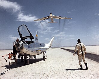 During a typical lifting body flight, the B-52—with the research vehicle attached to the pylon mount on the right wing between the fuselage and inboard engine pod—flew to a height of about 45,000 feet (14,000 m) and a launch speed of about 450 mph (720 km/h).[1]