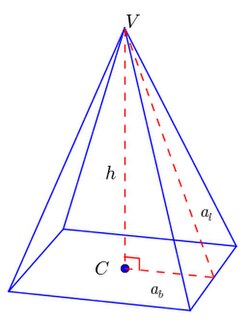 [editar | editar código]A altura de uma pirâmide é a distância entre o vértice e o plano da base. Se a pirâmide for reta, então é igual à distância do centro da base ao vértice da pirâmide.[1][2]