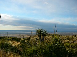 The elevation in the Chihuahuan Desert varies from about 1,750 to 6,000 feet (500 to 1,800 meters), as well as several larger mountain ranges within or bordering this desert including the Black Range, Organ Mountains, Capitan Mountains, Manzano Mountains, Sacramento Mountains, Sandia Mountains, Magdalena Mountains, and Chiracahua Mountains, plus many smaller mountain ranges contained in the area, namely the Animas, San Andres, Guadalupe Mountains, and Doña Ana Mountains in New Mexico; and the Franklin, Hueco, and Davis Mountains in Texas. It also reaches up into the foothills of the higher ranges such as the Black Range and Oscura Mountains in New Mexico. High above the desert, these forest-covered and sometimes snow-capped mountains form sky islands, with radically different flora and fauna than the surrounding desert below. The sky islands also supply the surrounding desert foothills with flowing water during the spring runoff and after the summer storms of the New Mexican monsoon season. The Chihuahuan is a "rain shadow" desert, formed between two mountain ranges (the Sierra Madre Occidental on the west and the Sierra Madre Oriental on the east) which block oceanic precipitation from reaching the area.[21] The Chihuahuan Desert is considered the "most biologically diverse desert in the Western Hemisphere and one of the most diverse in the world," and includes more species of cacti than any other desert in the world.[22] The most prolific plants in this region are agave, yucca and creosote bushes,[20] in addition to the ubiquitous presence of various cacti species.