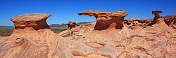 The Colorado Plateau varies from the large stands of forests in the west, including the largest stand of ponderosa pine trees in the world, to the Mesas to the east.[28] The Colorado Plateau consists mostly of high desert. Within the Southwest U.S. region, the Colorado is bordered to the south by the Mogollon Rim and the Sonoran Desert, to the west by the Mojave Desert, and to the east by the Rocky Mountains, the Rio Grande Rift valley, and the Llano Estacado.[24] The Plateau is characterized by a series of plateaus and mesas, interspersed with canyons.[24] The most dramatic example is the Grand Canyon.[29] But that is one of many dramatic vistas included within the Plateau, which includes spectacular lava formations, "painted" deserts, sand dunes, and badlands.[30] One of the most distinctive features of the Plateau is its longevity, having come into existence at least 500 million years ago.[31] The Plateau can be divided into six sections, three of which fall into the Southwest region. Beginning with the Navajo section forming the northern boundary of the Southwestern United States, which has shallower canyons than those in the Canyonlands section just to its north; the Navajo section is bordered to the south by the Grand Canyon section, which of course is dominated by the Grand Canyon; and the southeasternmost portion of the Plateau is the Datil section, consisting of valleys, mesas, and volcanic formations.[32] Albuquerque is the most populous city often considered at the edge of this portion contained in the Southwest region, but Santa Fe, New Mexico and Flagstaff, Arizona, are also significant population centers.