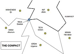 [edit]The series is set in the same Alliance-Union universe of Downbelow Station, but in a region of space in the opposite direction from Earth as the Alliance and Union. It is occupied by a number of spacefaring civilizations bound by a set of trade treaties into a so-called Compact. The Compact is not a political organization, and has no government; it deals only with open trade, leaving the component civilizations to resolve conflicts between themselves.