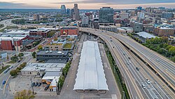 As the freeway continues, and closer to Grand Rapids, it is lined with more commercial and light industrial properties.[13] The unincorporated suburb of Cutlerville lies to the east as US 131 approaches M-6, the South Beltline Freeway, and meets in the largest freeway interchange in West Michigan. Gaining a third lane in each direction, the interchange stretches over a half mile (0.8 km) in width and over a mile (1.6 km) in length[b] and encompasses 27 bridges and 18 retaining walls.[16] US 131 continues north through the city of Wyoming to the more suburban residential areas near the southern city limits of Grand Rapids north of M-11 (28th Street).[12][13]