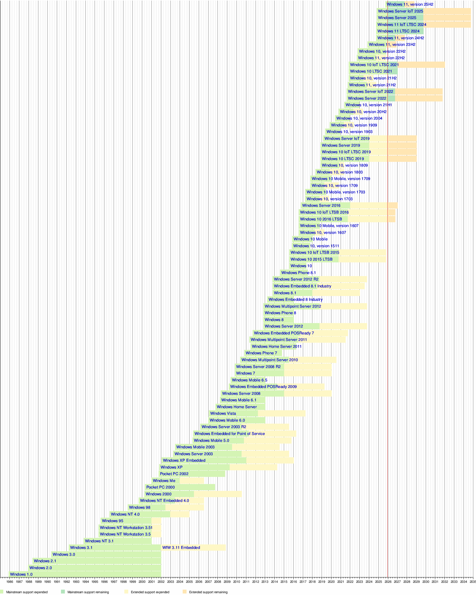 As of 2025,[update] the only active top-level family is Windows NT.[citation needed] The first version, Windows NT 3.1, was intended for server computing and corporate workstations. It grew into a product line of its own and now consists of four sub-families that tend to be released almost simultaneously and share the same kernel.